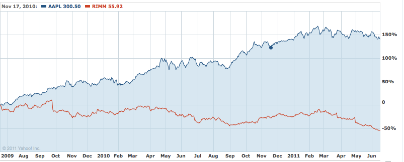 2) Catch-up – RIM has had to play catch-up on the smartphone/tablet technology race. They are lagging in both areas behind Apple and Google and not only that, but the news came out today that the Playbook (RIM’s version of the iPad) will be delayed, thus missing the “back to school” sales of this summer.